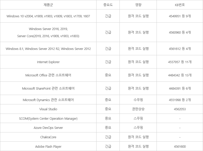 - 정보노출 취약점(CVE-2020-1160, CVE-2020-1206, CVE-2020-1217, CVE-2020-1232, CVE-2020-1261, CVE-2020-1263, CVE-2020-1268, CVE-2020-1290, CVE-2020-1296, CVE-2020-1348)