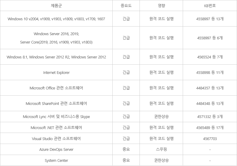 - 원격코드실행 취약점(CVE-2020-1032, CVE-2020-1036, CVE-2020-1040, CVE-2020-1041, CVE-2020-1042, CVE-2020-1043, CVE-2020-1350, CVE-2020-1374, CVE-2020-1400, CVE-2020-1401, CVE-2020-1407, CVE-2020-1408, CVE-2020-1409, CVE-2020-1410, CVE-2020-1412, CVE-2020-1421, CVE-2020-1435, CVE-2020-1436)